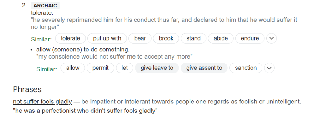 The word suffer, even in the archaic sense, means to tolerate or subject someone to a negative experience, attitude of behaviour. With this in mind, it is arguable that Exodus 22:18 is actually telling us to not suffer through a witch, meaning that we should not tolerate witchcraft to live. We should not seek out witchcraft, or any kind of sorcery, to sustain us for life. Keep in mind that up to this point, God has witnessed man not only commit sin but be subject to the Egyptians who referred to sorcerers mimicking God to deny belief in Him.